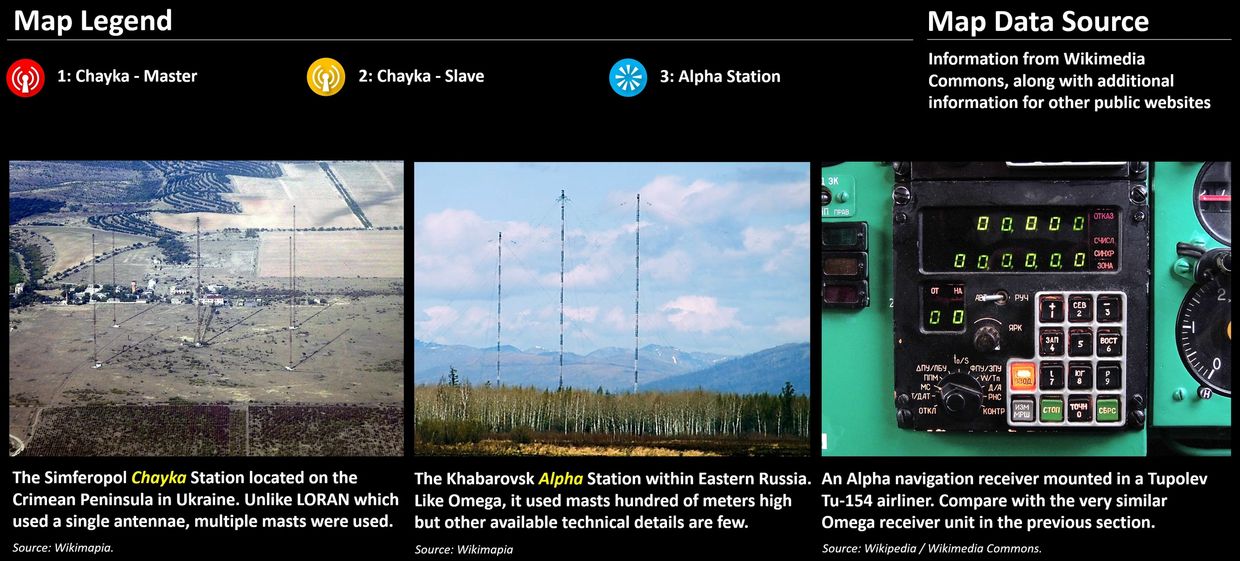As might be expected for Soviet systems constructed in the midst of the Cold War (and still mainly controlled by an autocratic government) few technical details are available to outsiders – even the exact height of many of the antenna towers are unknown. These enigmatic systems were primarily military: Chayka was observed to have some civilian use, but Alpha was the purview of warplanes and submarines traversing the north polar region. Russia also reportedly relied on Chayka during the 2022 Ukraine War as it is more immune to jamming / spoofing than satellite systems. This would perhaps explain both system’s continued secrecy and why they still remain operational as of 2024, although the 2 Alpha transmitters added in 1991 went off-air in 2010.